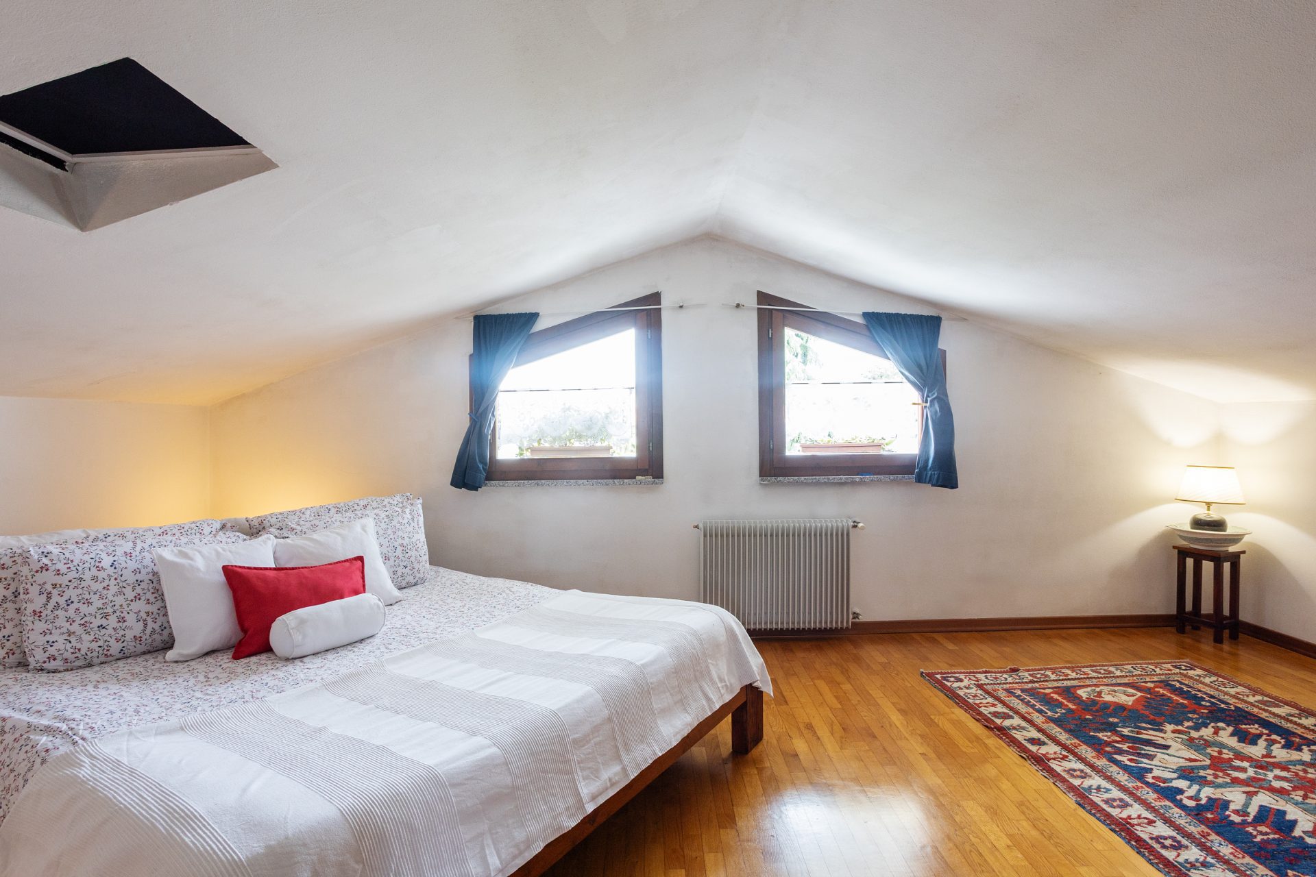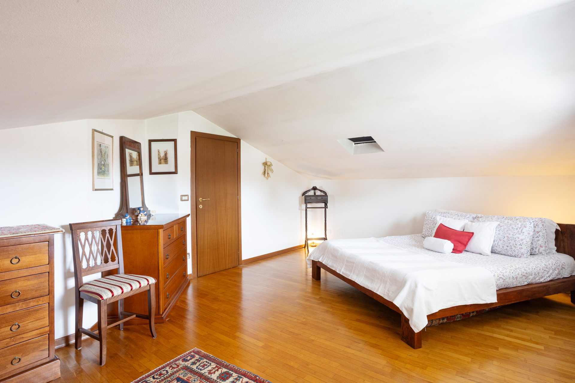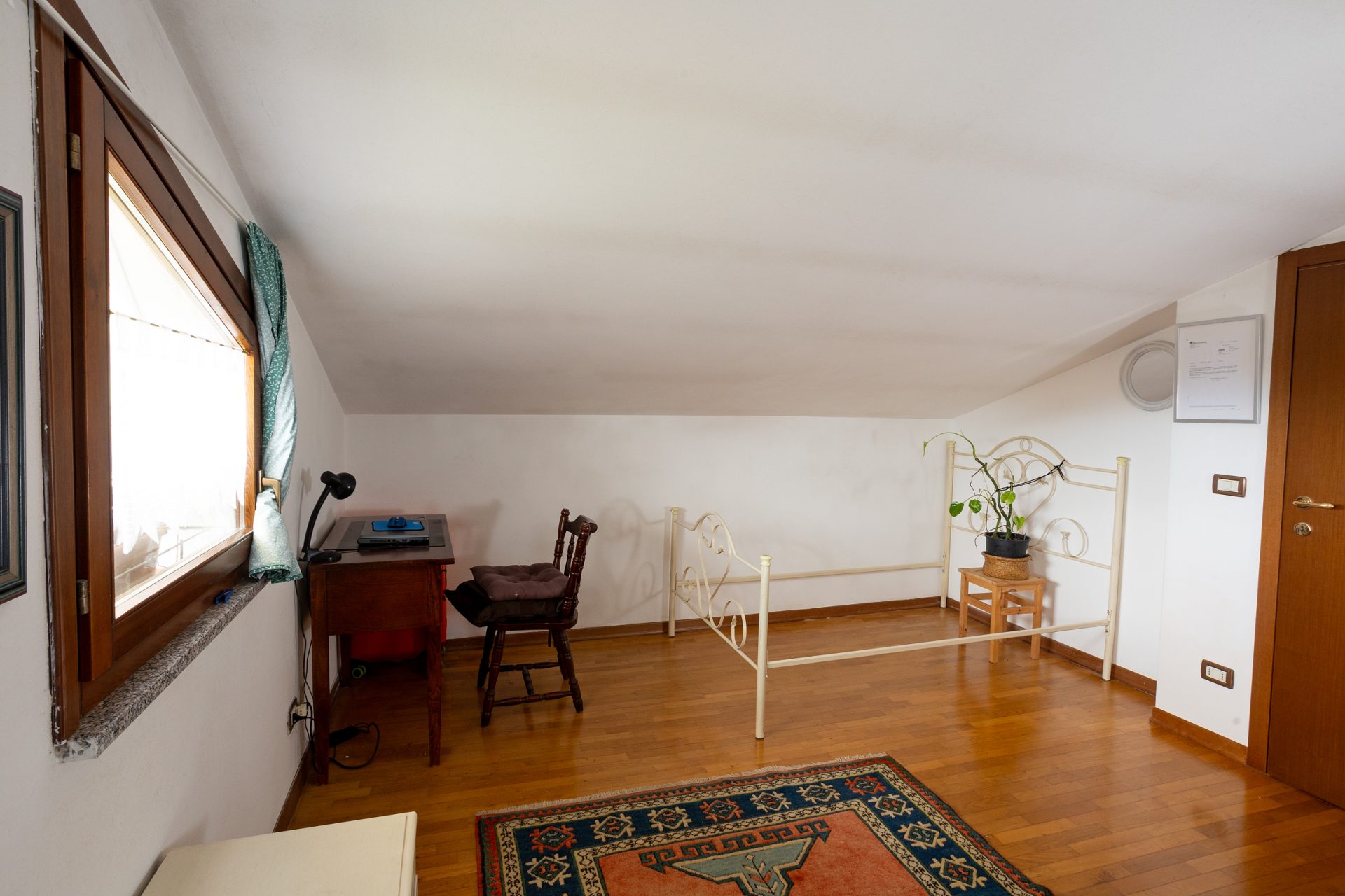 Al primo piano troviamo il vano soffitta leggermente mansardato, con ampio lucernaio e finestre: il vano risulta completamente arredato e diviso composto da due camere matrimoniali ed un bagno.