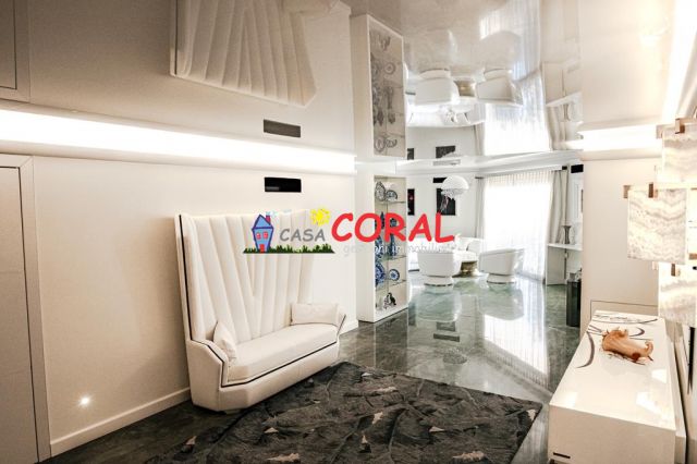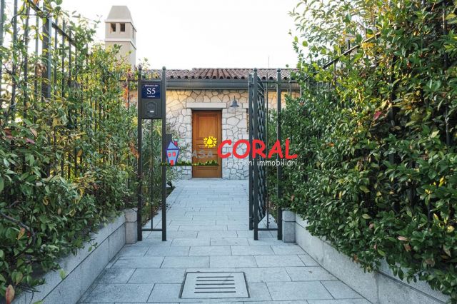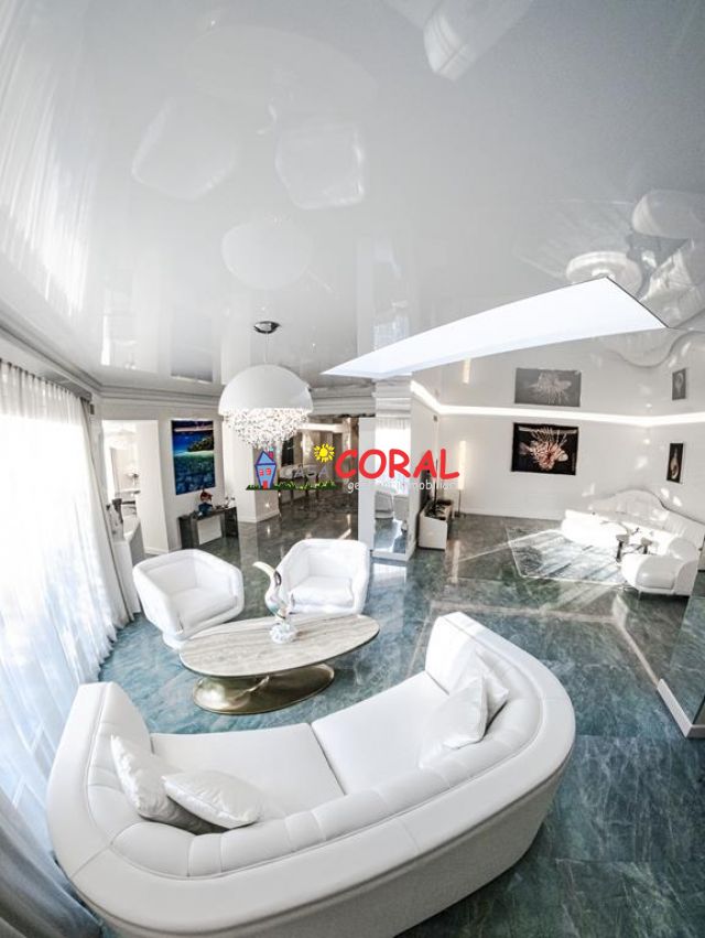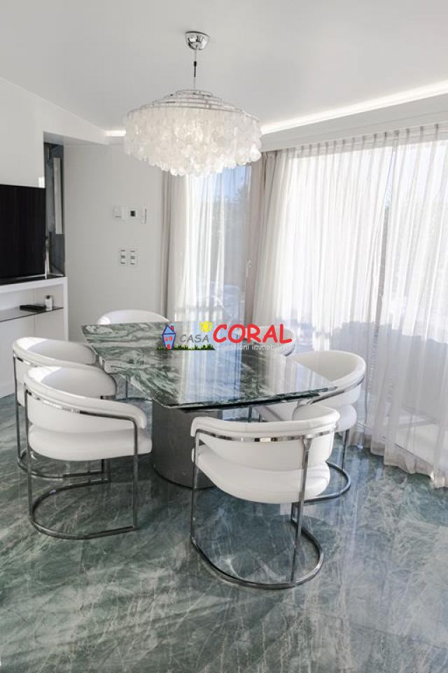 L’unità si compone di tre livelli e comprende una zona living di oltre 70 mq, cucina separata e abitabile, bagno, quattro/cinque camere matrimoniali, 3 bagni, guardaroba, terrazze, giardino con piscina e 4 garage.