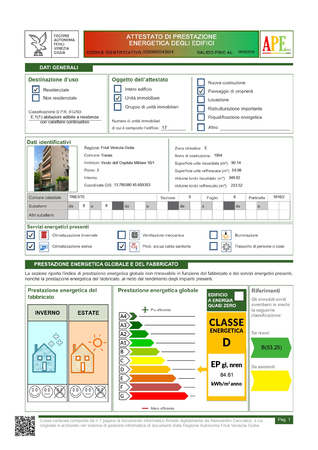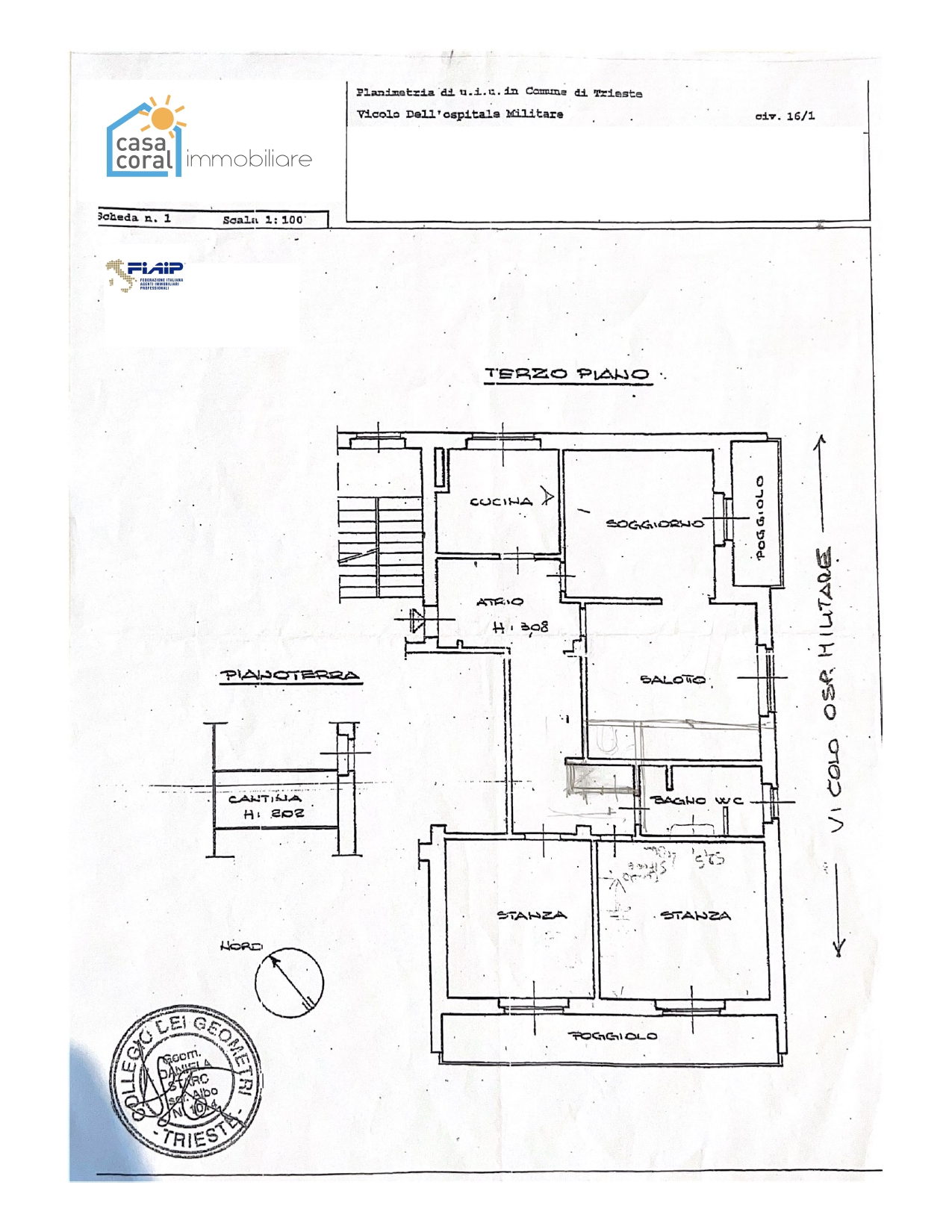 Unità condominiale con alloggio al terzo piano e cantina marcato M in giallo con 75/1000 p.i. cpt 1 della PT 2053 di Scorcola, pc nuova 1616/2 edificio e corte Vicolo Ospedale Militare 16/1 – numero anagrafico 938 di Scorcola – Abitabilità Intervento Edilizio 1954: Ufficio Tecnico, prot. corr. n. 713/ 10 – 1954 dd. 05/11/1958
